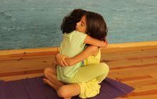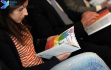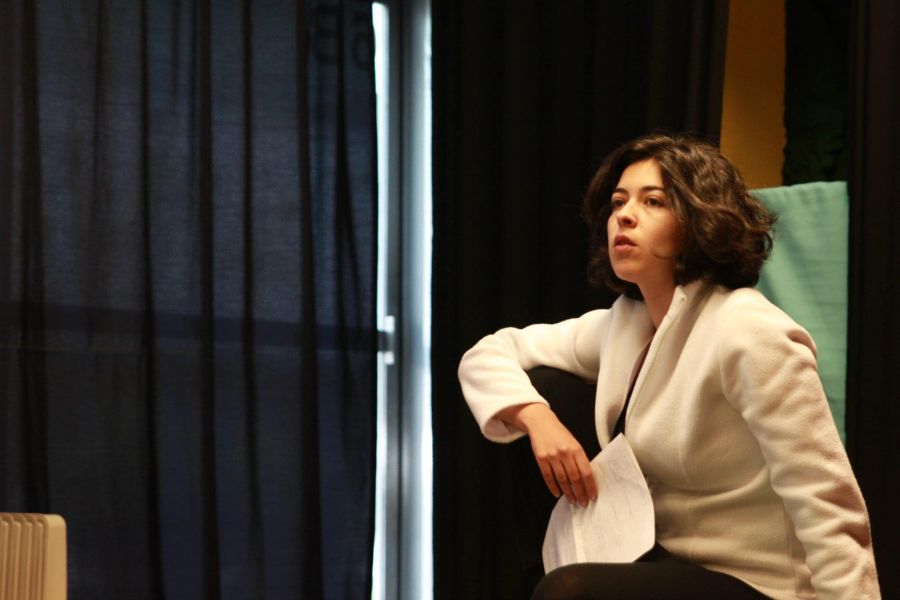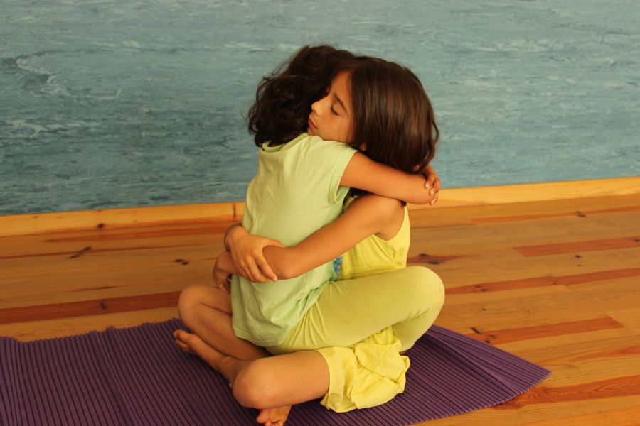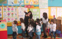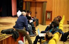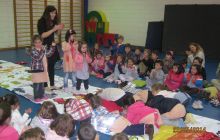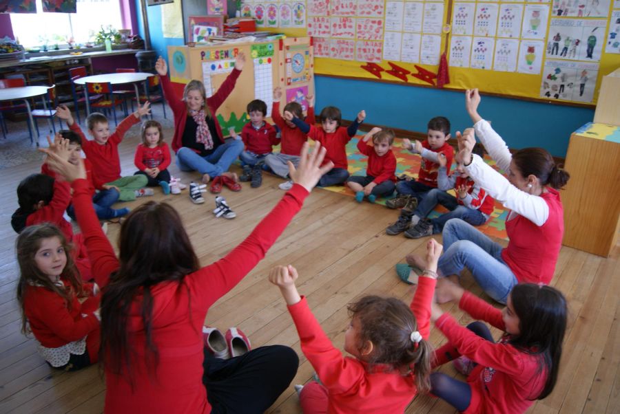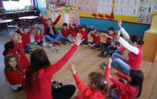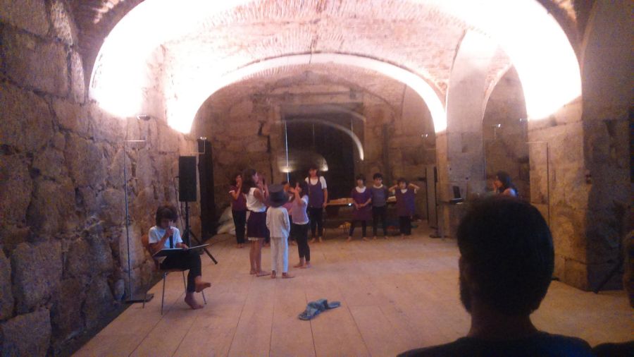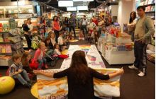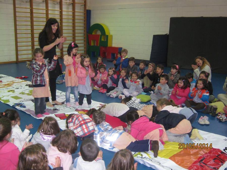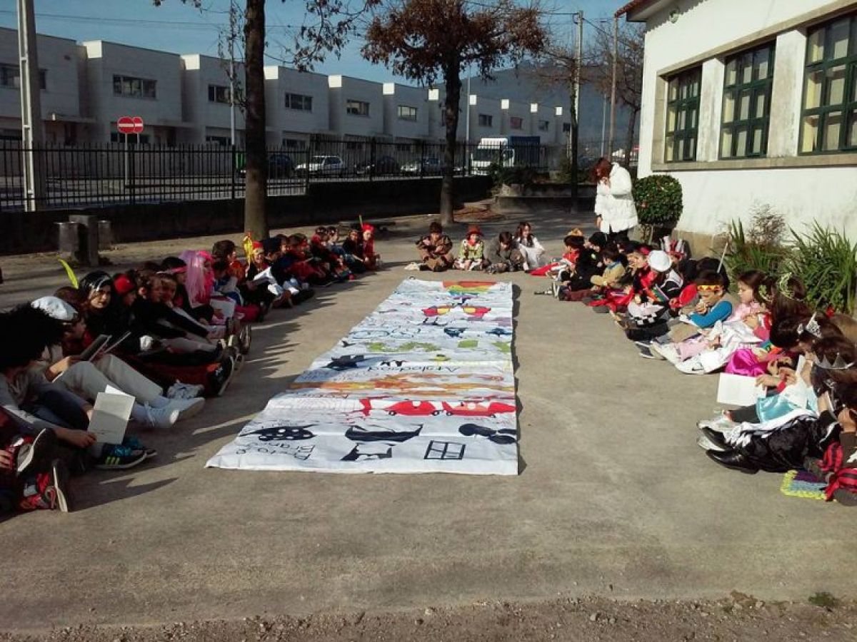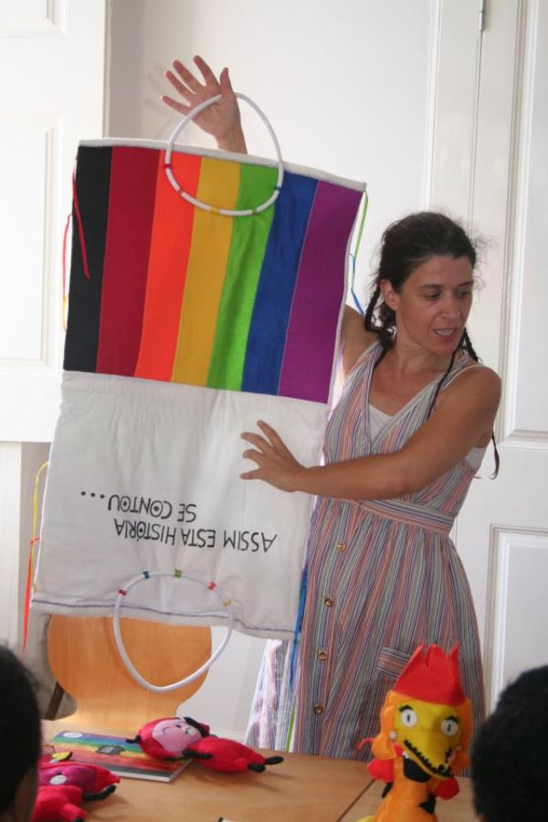 É uma sessão de contos recorrendo a um tapete de sete metros e interação com crianças.