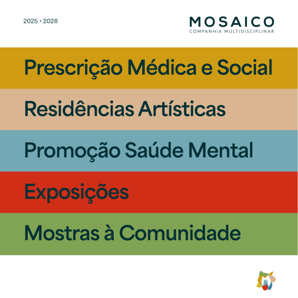 O Mosaico - companhia multidisciplinar tem como objetivo promover a saúde mental de grupos vulneráveis, como pessoas com prescrição médica na área da saúde mental e pessoas com deficiência intelectual, através de intervenções artísticas inclusivas. Utilizando o modelo de “Stepped Care”, as atividades adaptam-se à gravidade dos sintomas e incluem várias expressões artísticas como dança, artes plásticas, media artes e música, criando um ambiente de inclusão social e apoio emocional.