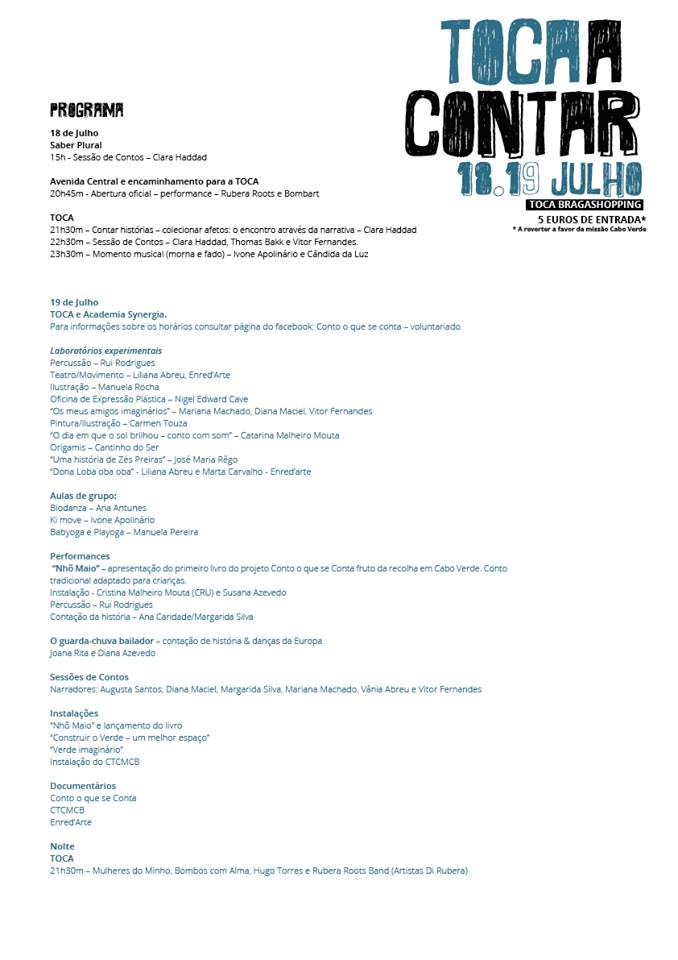 O projeto TOCA a Contar é um festival de fusão de tradições explorando as diversas artes e fazendo cruzamento de linguagens artísticas tendo por base o conto tradicional.