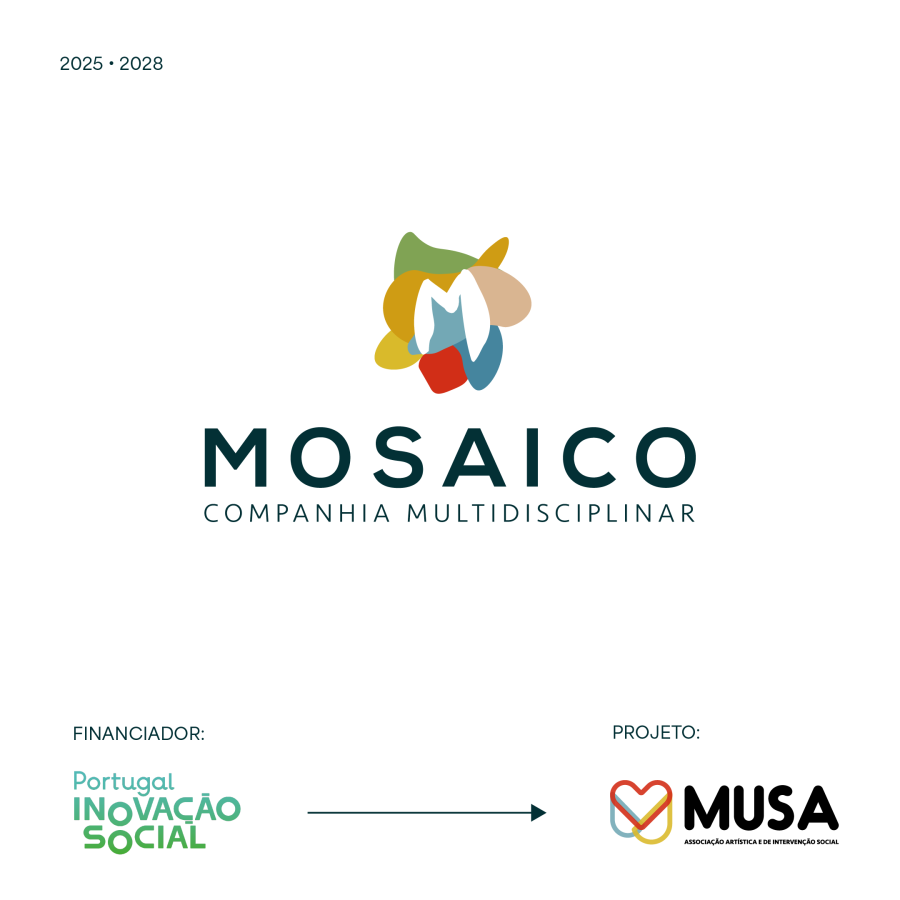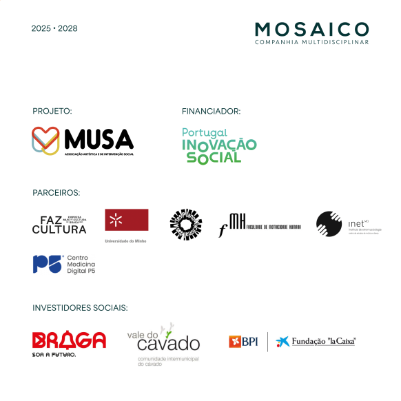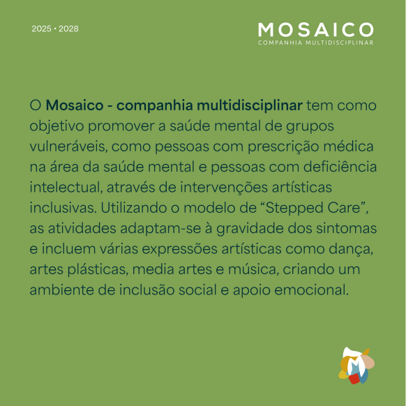 O Mosaico - companhia multidisciplinar tem como objetivo promover a saúde mental de grupos vulneráveis, como pessoas com prescrição médica na área da saúde mental e pessoas com deficiência intelectual, através de intervenções artísticas inclusivas. Utilizando o modelo de “Stepped Care”, as atividades adaptam-se à gravidade dos sintomas e incluem várias expressões artísticas como dança, artes plásticas, media artes e música, criando um ambiente de inclusão social e apoio emocional.